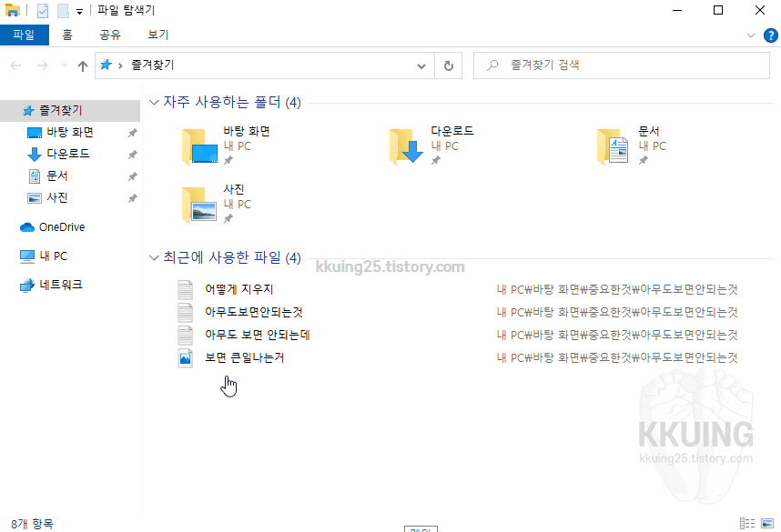 윈도우 설치 후 별도로 설정을 하지 않았다면 윈도우 탐색기를 실행하였을 때 [ 최근에 사용한 파일 목록 ]들이 나타납니다.